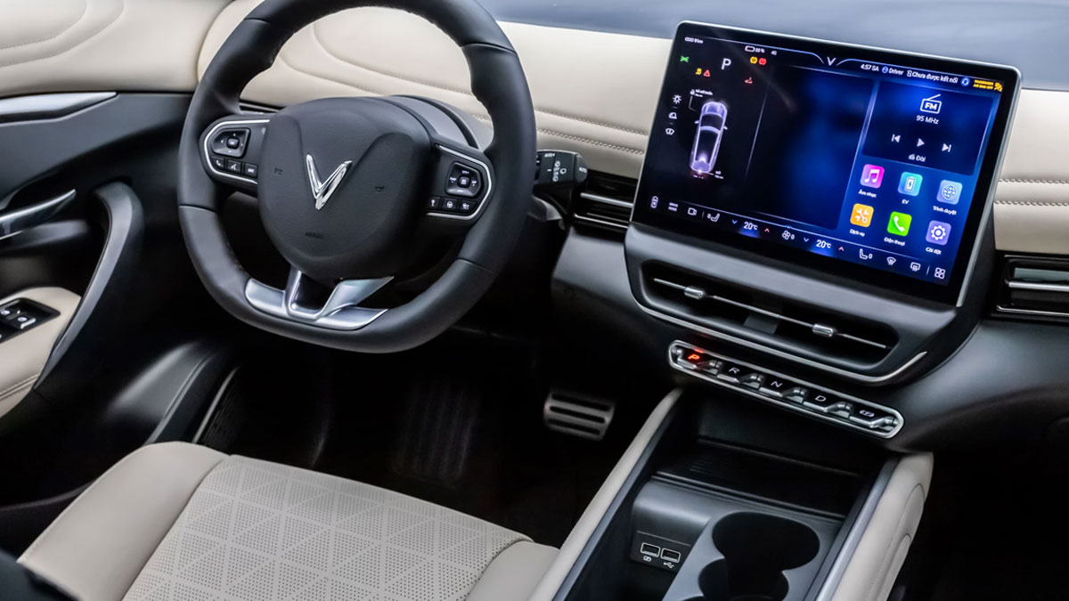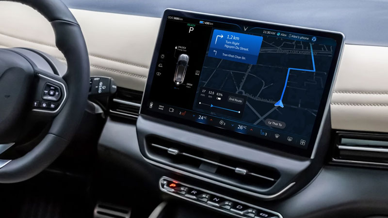 Với kích cỡ 12,9 inch, có thể tùy chỉnh cá nhân hóa theo người dùng. Màn hình giải trí cảm ứng của VF 7 có thể giúp điều khiển các chức năng trên xe bằng cách vuốt/chạm nhẹ hoặc ra lệnh cho trợ lý ảo qua giọng nói.